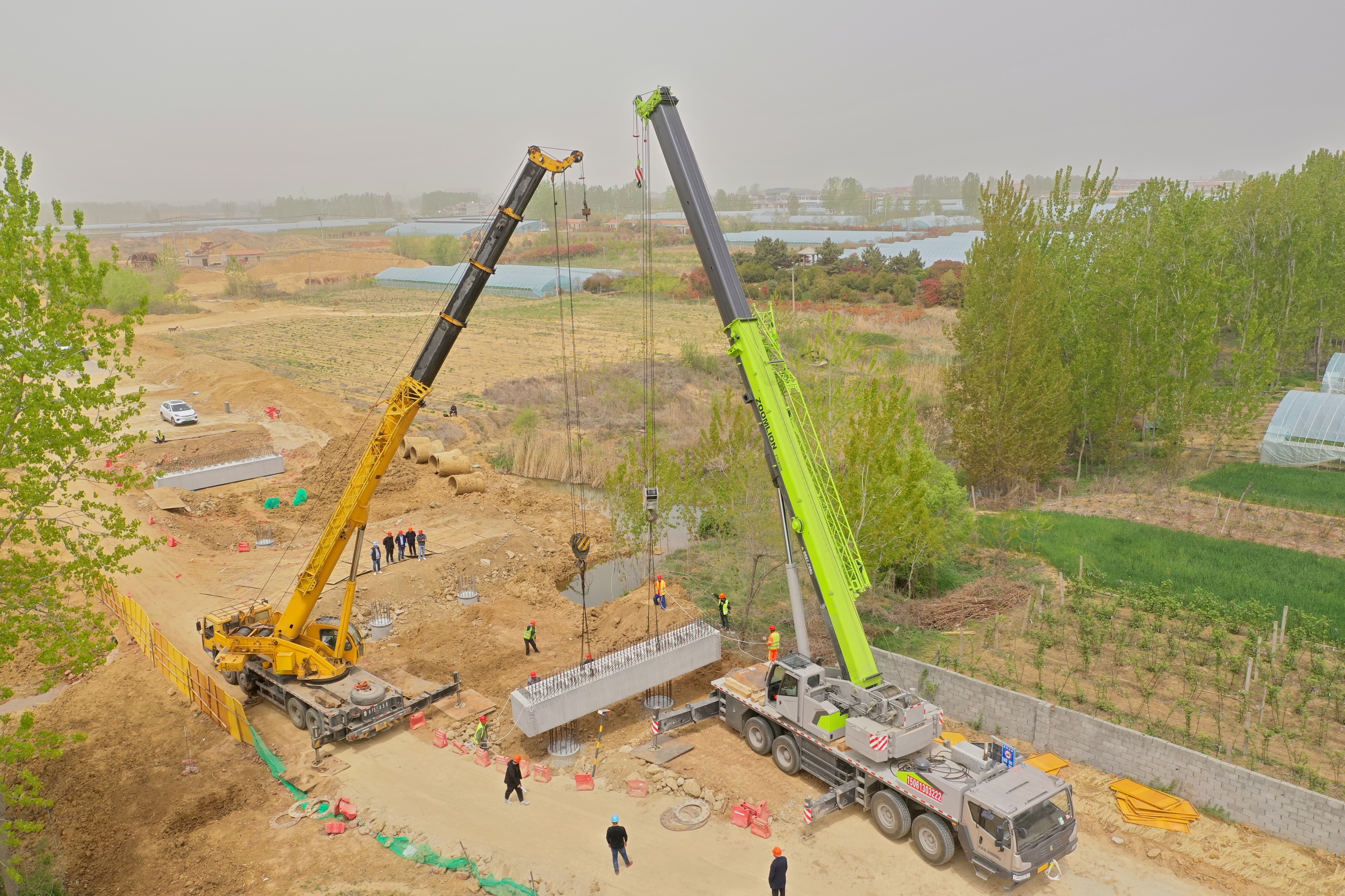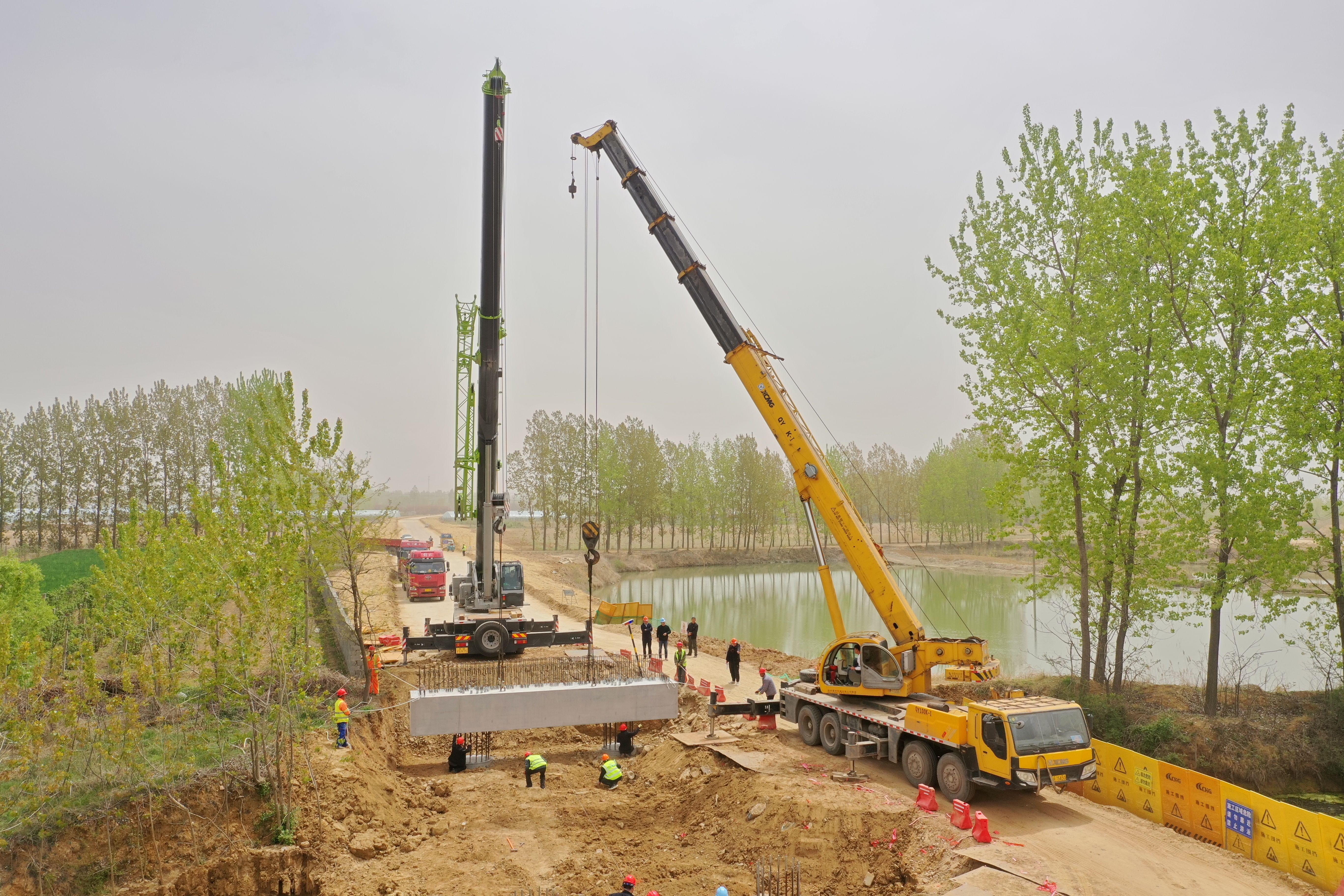 4月16日,随着两台吊车将一片51吨台帽精准吊装,景观一号桥上部结构施工正式启动,也是连云港市第一个桥梁下部结构采用预制盖梁的实施工艺。