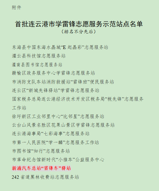 近日,连云港市文明办命名了首批连云港市学雷锋志愿服务示范站点15个,覆盖众多行业及领域。其中,连汽新浦汽车总站“雷锋车”驿站成功入选。