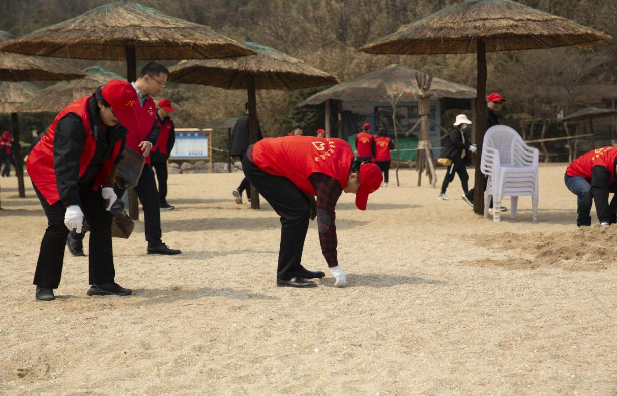 活动中,一群头戴小红帽、身穿红马甲的爱心志愿者,头顶春季暖阳,在绵软的沙滩上,时而弯腰捡拾沙子里或海浪里冲刷而来的废弃物,小心地装进垃圾袋,并分类投放到垃圾桶中。