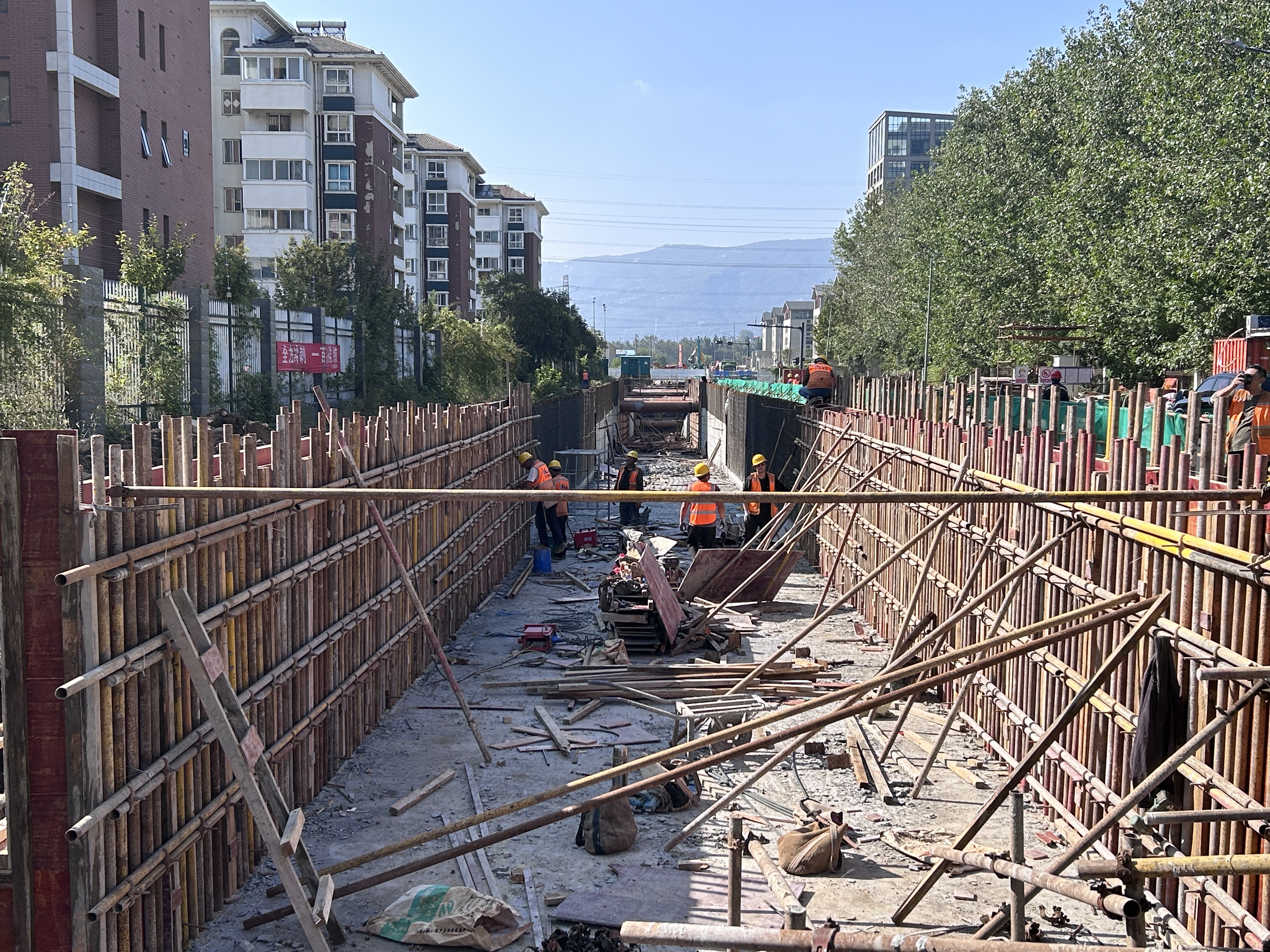 工程位于连云区云山街道,于沃壤山路东侧设置人非通道,下穿G228国道,实现沃壤山路在G228国道处的联通。目前已顺利完成过路箱涵维护灌注桩施工,为后续开挖提供工作面和安全保障。该工程地上设有高压电,地下有高压电缆,燃气、自来水、污水管道以及通信、军用电缆等贯穿其中,施工环境较为艰难复杂。面对紧张的工期要求与复杂多变的施工环境,项目部科学规划、精心组织,每日召开进度协调会,加强各方协调沟通,及时解决施工中遇到的难题,确保各施工环节紧密衔接、高效推进。目前北段U型槽基本成型,南段U型槽开挖基本到位,过路箱涵维护灌注桩施工完成,南半幅箱涵基础正在开挖。