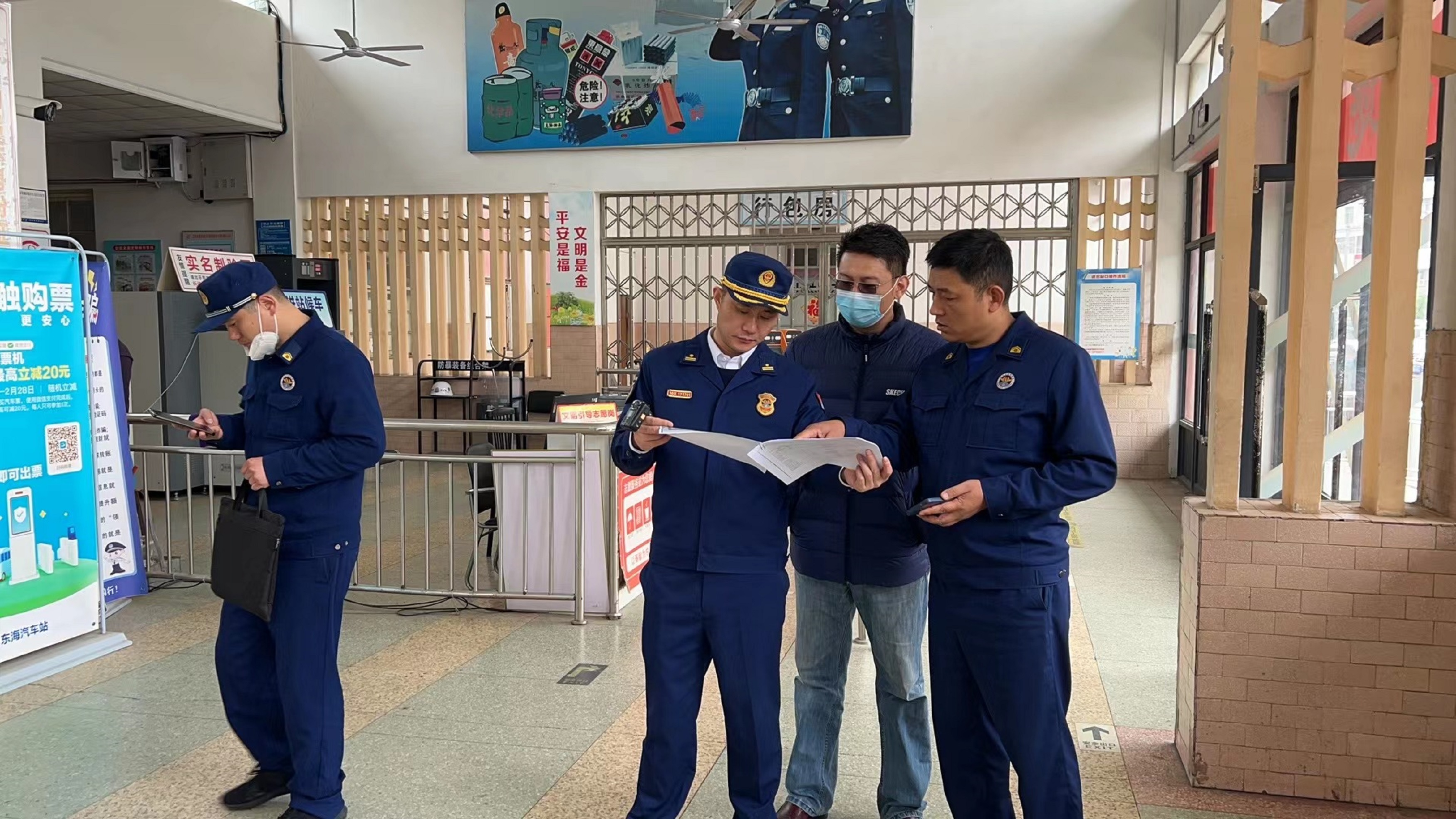 督察组一行实地查看候车室、售票厅等场所的消防安全管理制度是否落实、车站内消防设施是否完好有效、安全疏散通道及安全出口的畅通情况。