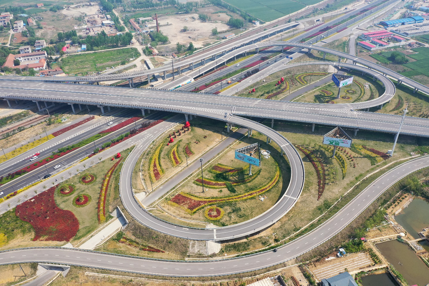 “五一”前夕,俯瞰朝阳互通景观园,处处繁花似锦,为春天的港城再添一道亮丽的生态文明风景线。