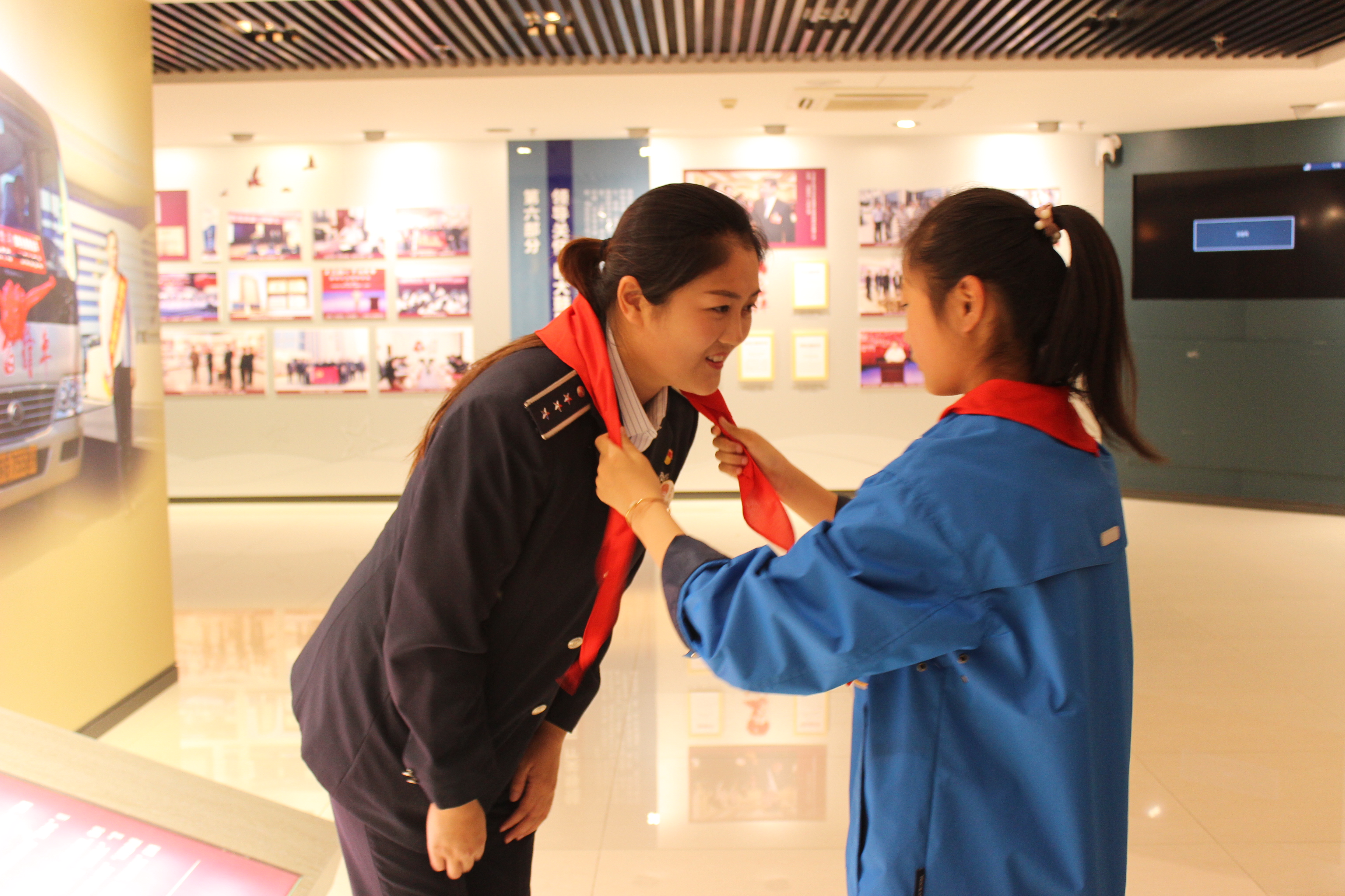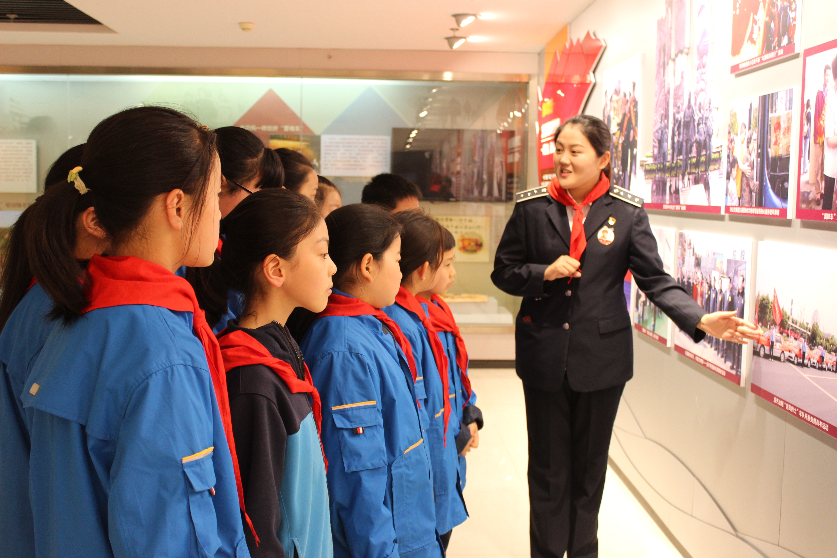 新浦汽车总站党总支副书记权太琦带领少先队员们参观了整个陈列馆,并为他们进行了生动的讲解。少先队员们通过一件件老物件、一张张照片详细了解了“雷锋车”五 十八年来的光辉历程。“雷锋车”组的感人事迹和奉献精神让同学们十分敬佩,“雷锋车”组的风雨历程,也让同学们对“雷锋车”精神有了更深刻的认识。少先队一行为权太琦献上红领巾,并相继提出“雷锋车”相关问题,权太琦一一解答。