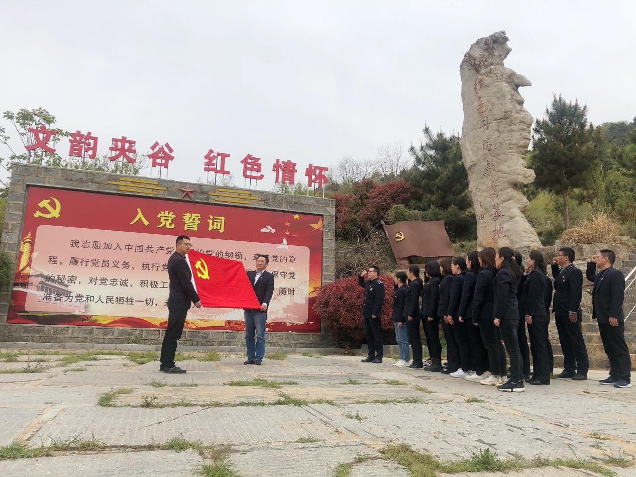 最后一站来到夹谷山国防洞,在夹谷山广场上,党员们佩戴党徽,面向党旗,庄严宣誓。在夹谷山国防洞,大家感叹于敌我兵力配备悬殊情况下,中国共产党以劣胜优、以弱胜强。这些胜利都离不开革命战士永不言败的革命精神和坚定的信念。