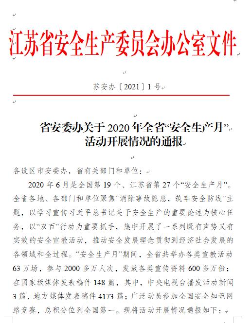 近日,乐投app最新版下载,乐投(中国)获得了由江苏省安全生产委员会授予的“2020年江苏省‘安全生产月’活动先进单位”荣誉称号。
