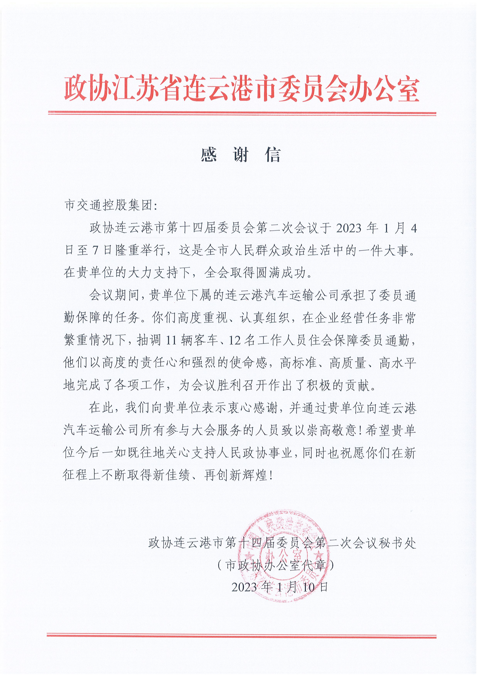 近日,从市交通控股乐投app最新版下载,乐投(中国)获悉,政协连云港市第十四届委员会第二次会议秘书处发来感谢信,对汽车公司在第十四届委员会第二次会议中的交通保障工作表示衷心感谢,对公司所有参与大会服务的人员致以崇高的敬意。