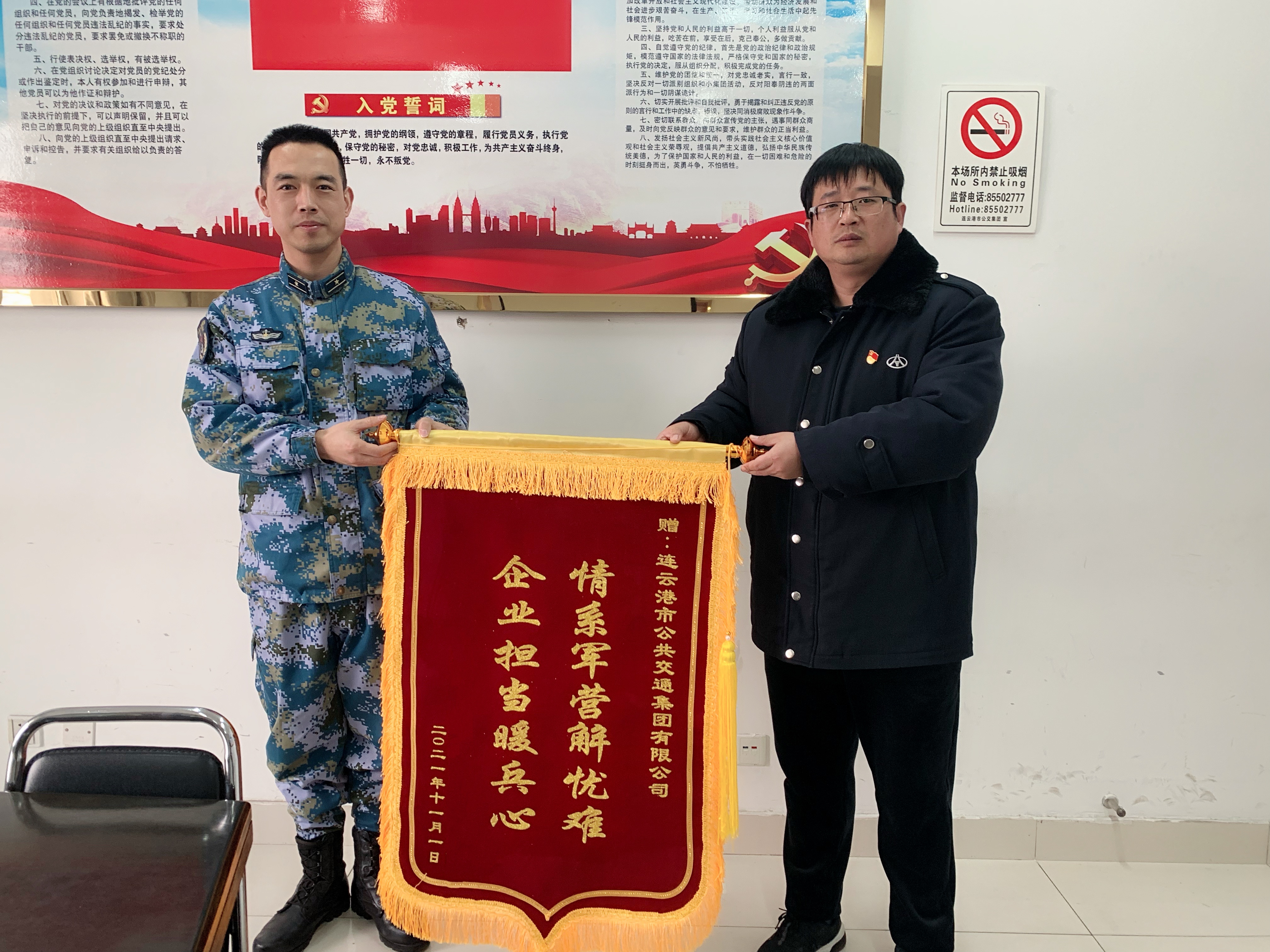 1月16日,解放军某部海军营区官兵代表特地赶到公交乐投app最新版下载,乐投(中国)公交事业二部,送来了一面写有“情系军营解忧难 企业担当暖兵心”的锦旗。