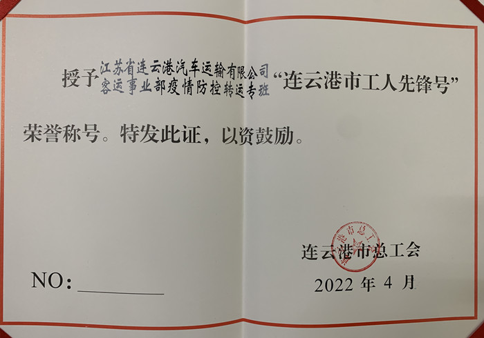 汽车公司客运事业部疫情防控转运专班荣获“连云港市工人先锋号”称号